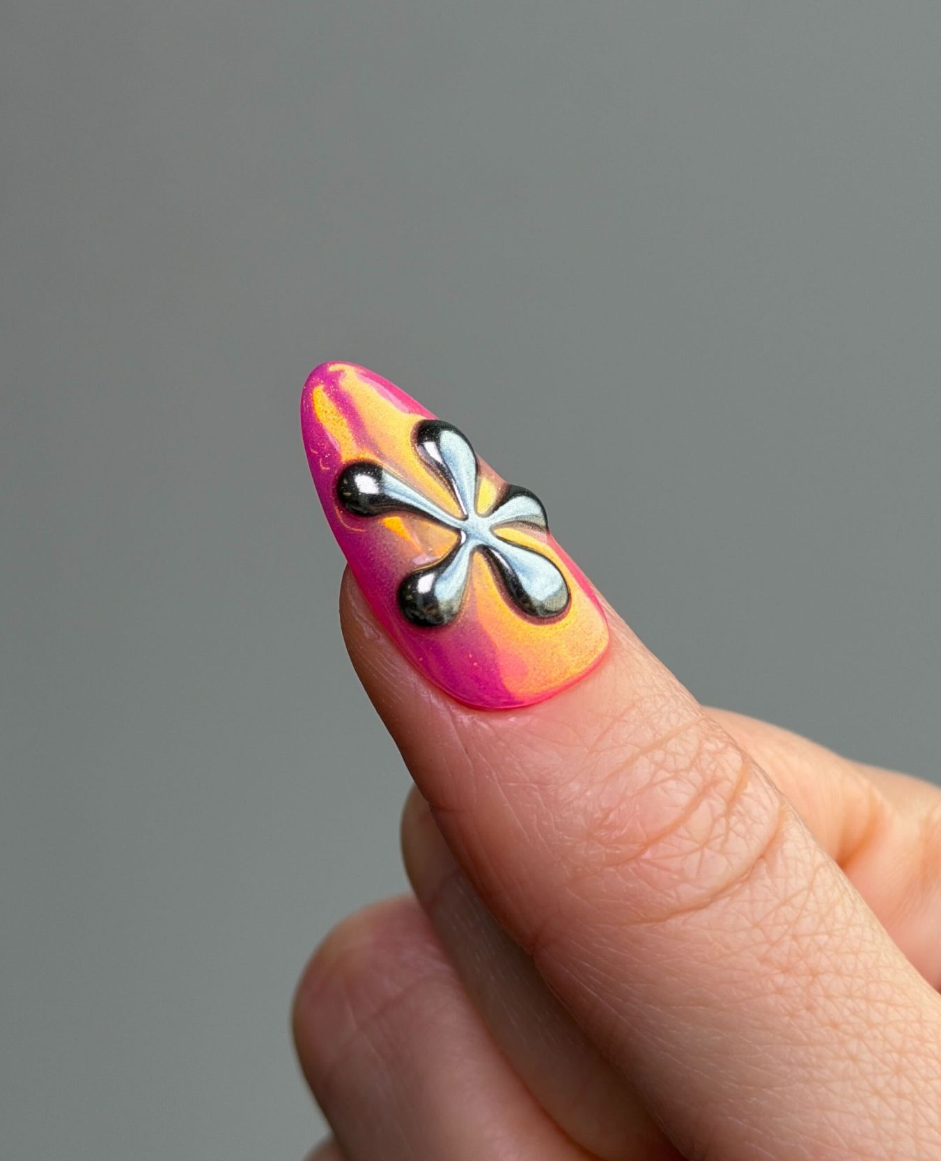 The aura nail blend paired with chrome and 3D detailing creates a bold, high-impact finish that’s perfect for statement sets.